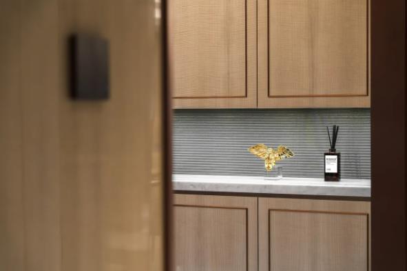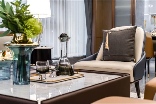 B3戶型空間以藍(lán)灰咖色為主色調(diào),材質(zhì)上使用金屬與捫皮的結(jié)合,木與金屬的搭配,不同質(zhì)感的材質(zhì)相互襯托相得益彰,通過精致的細(xì)節(jié)收口以及軟裝物料搭配呈現(xiàn)出奢華的高貴氣質(zhì)。